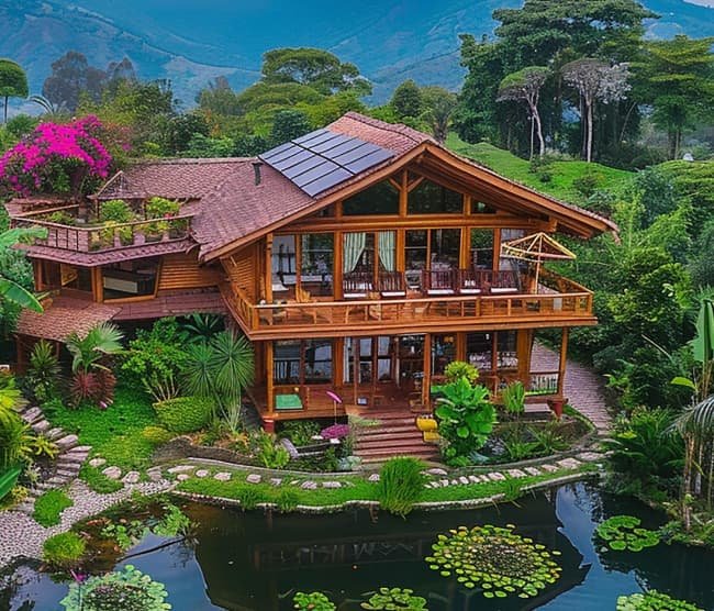 Throughout the interior, eco-friendly materials like reclaimed wood, bamboo flooring, and recycled glass countertops create a luxurious yet sustainable ambiance.